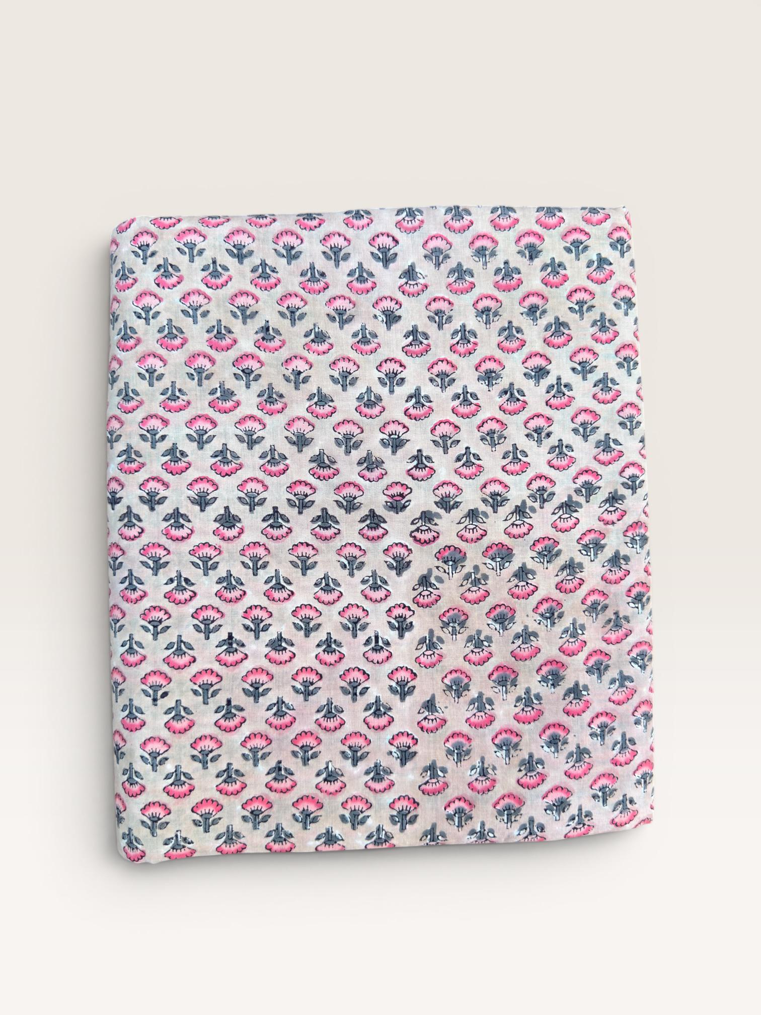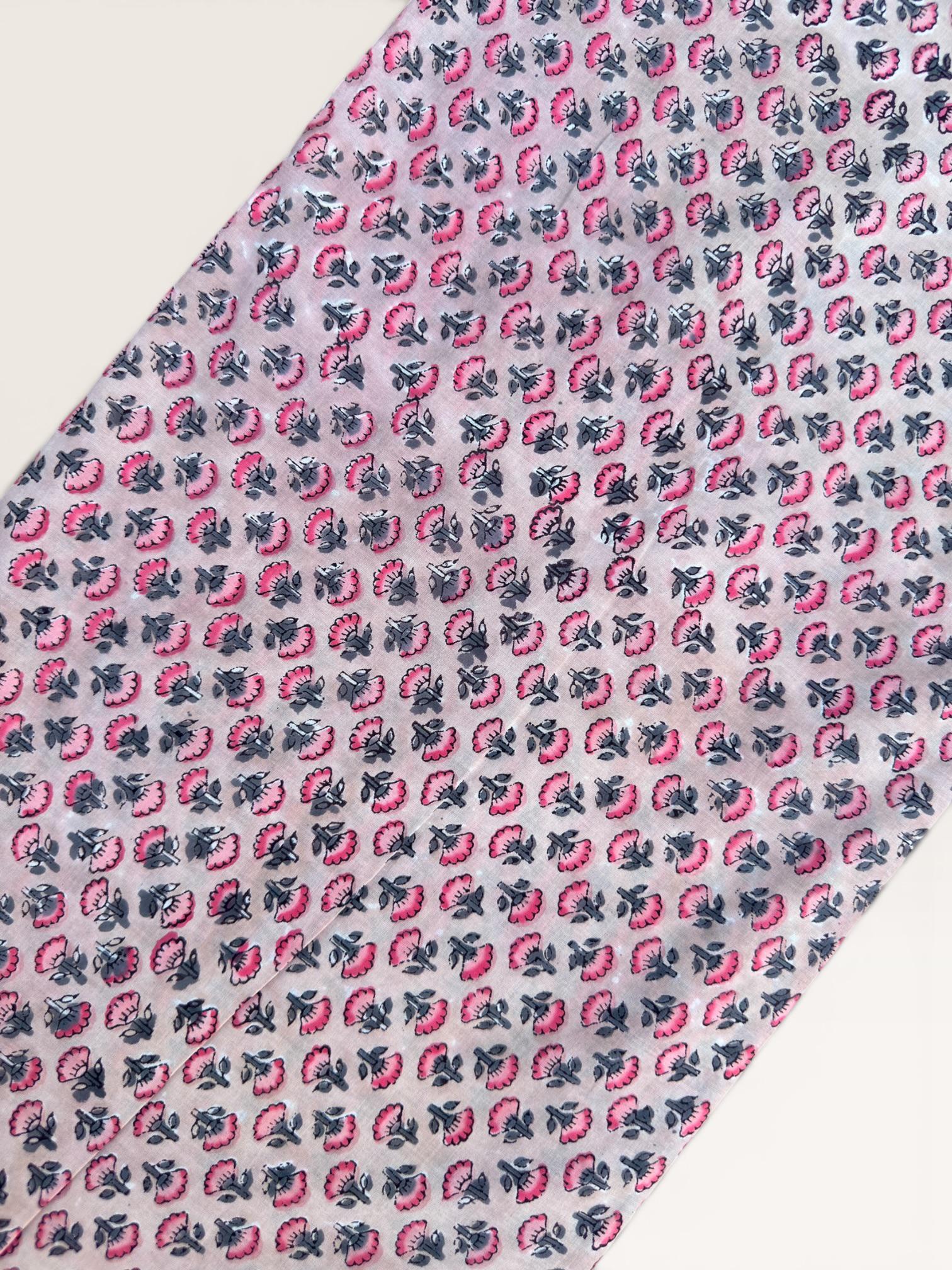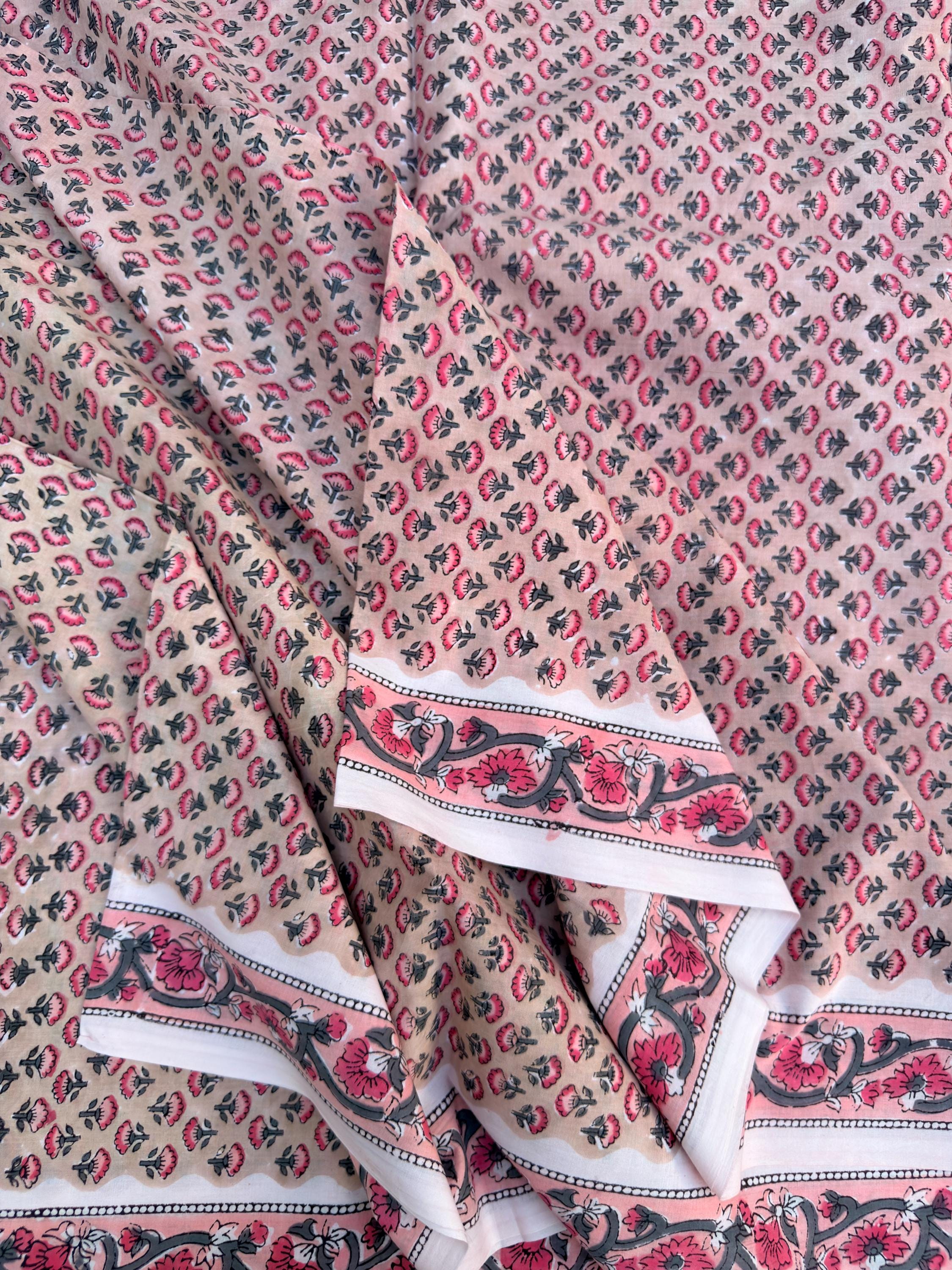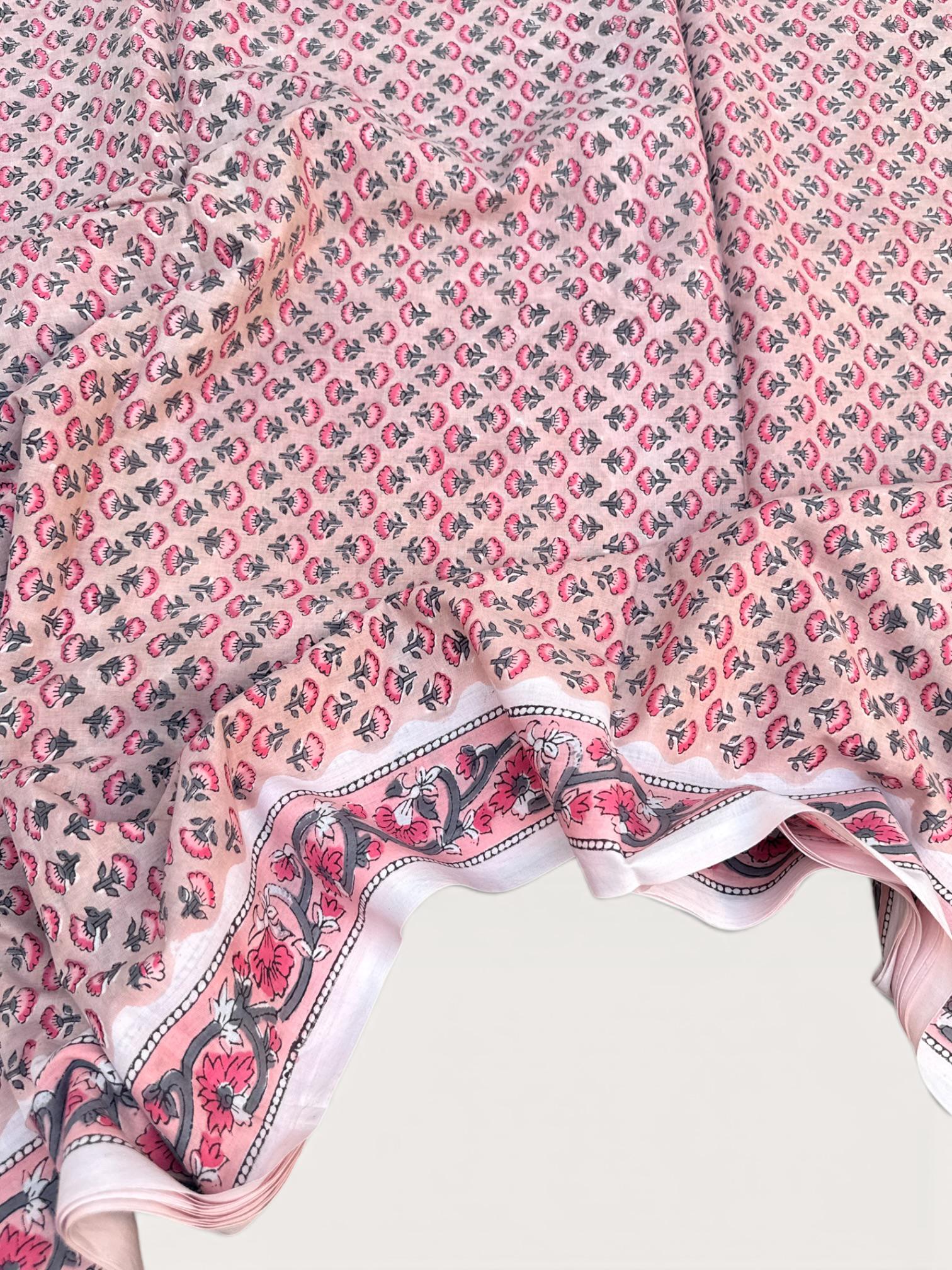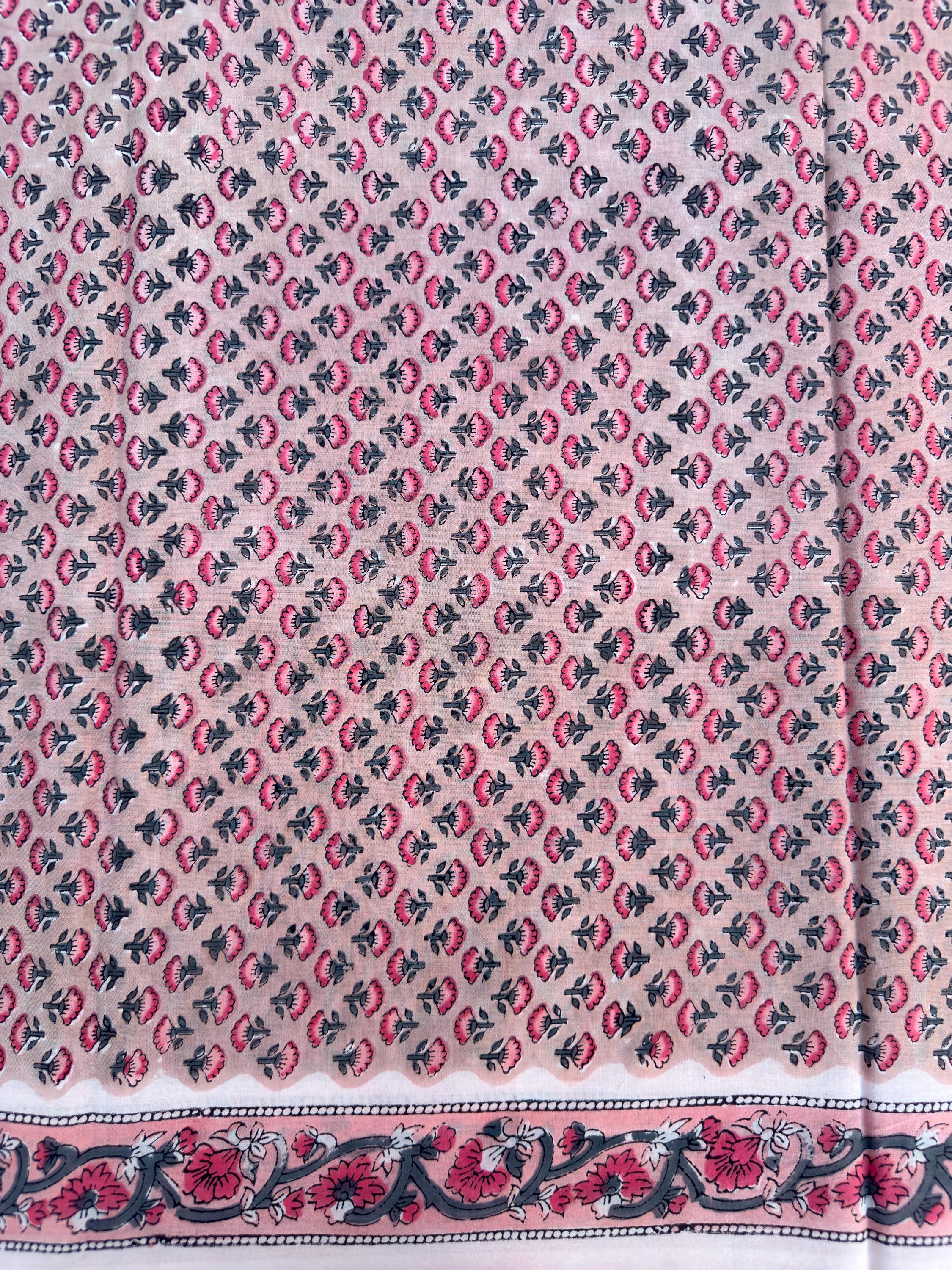 Each piece is carefully handcrafted using traditional block printing techniques, giving it a unique charm and artisanal touch. The delicate floral design paired with a detailed border adds sophistication and versatility to the fabric.