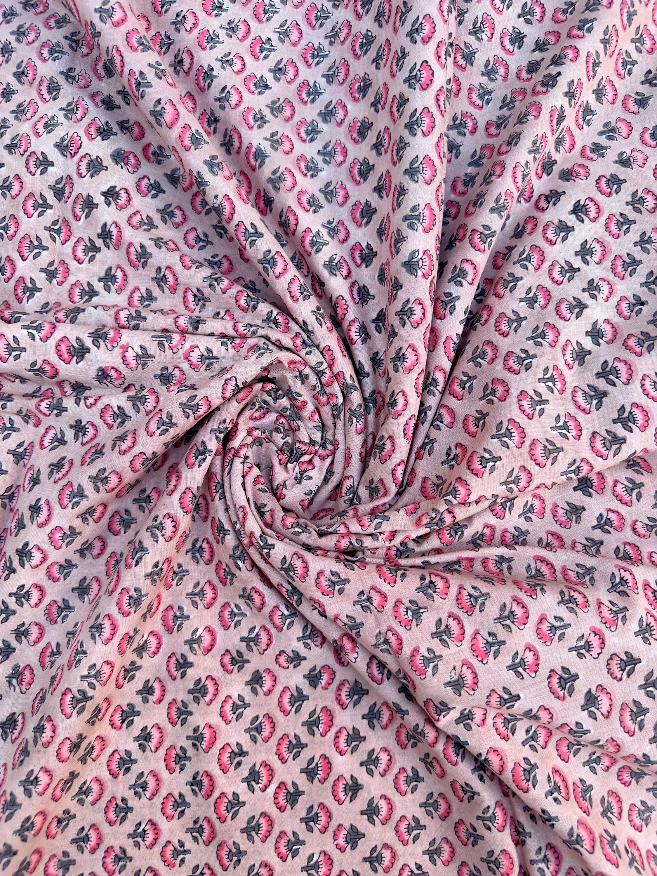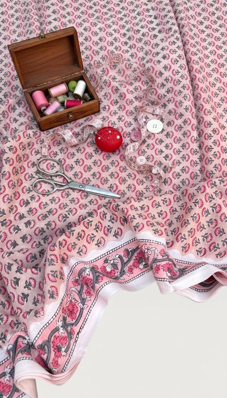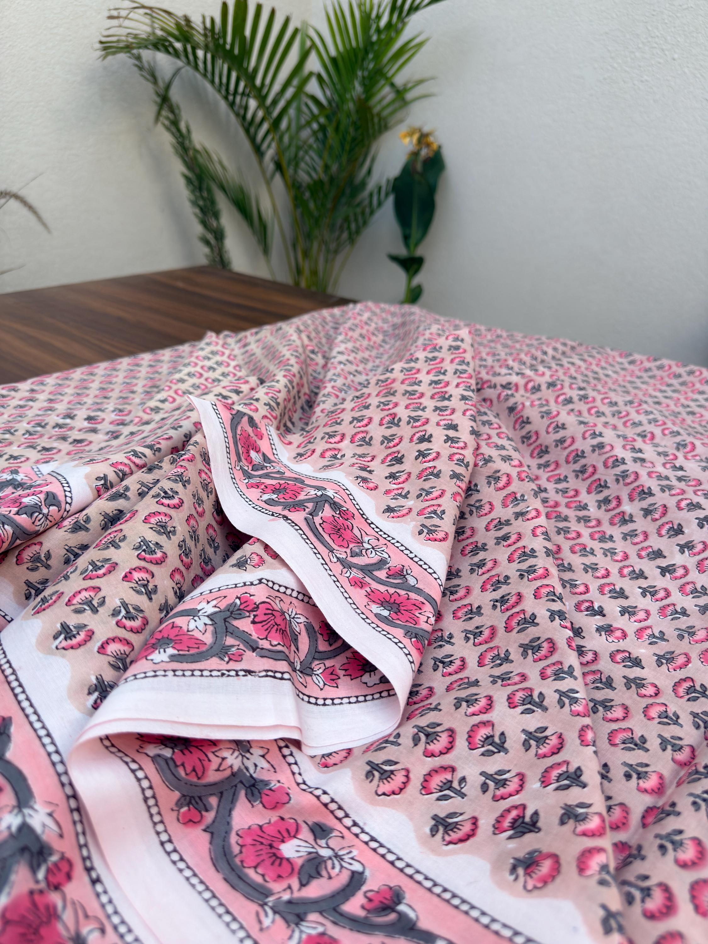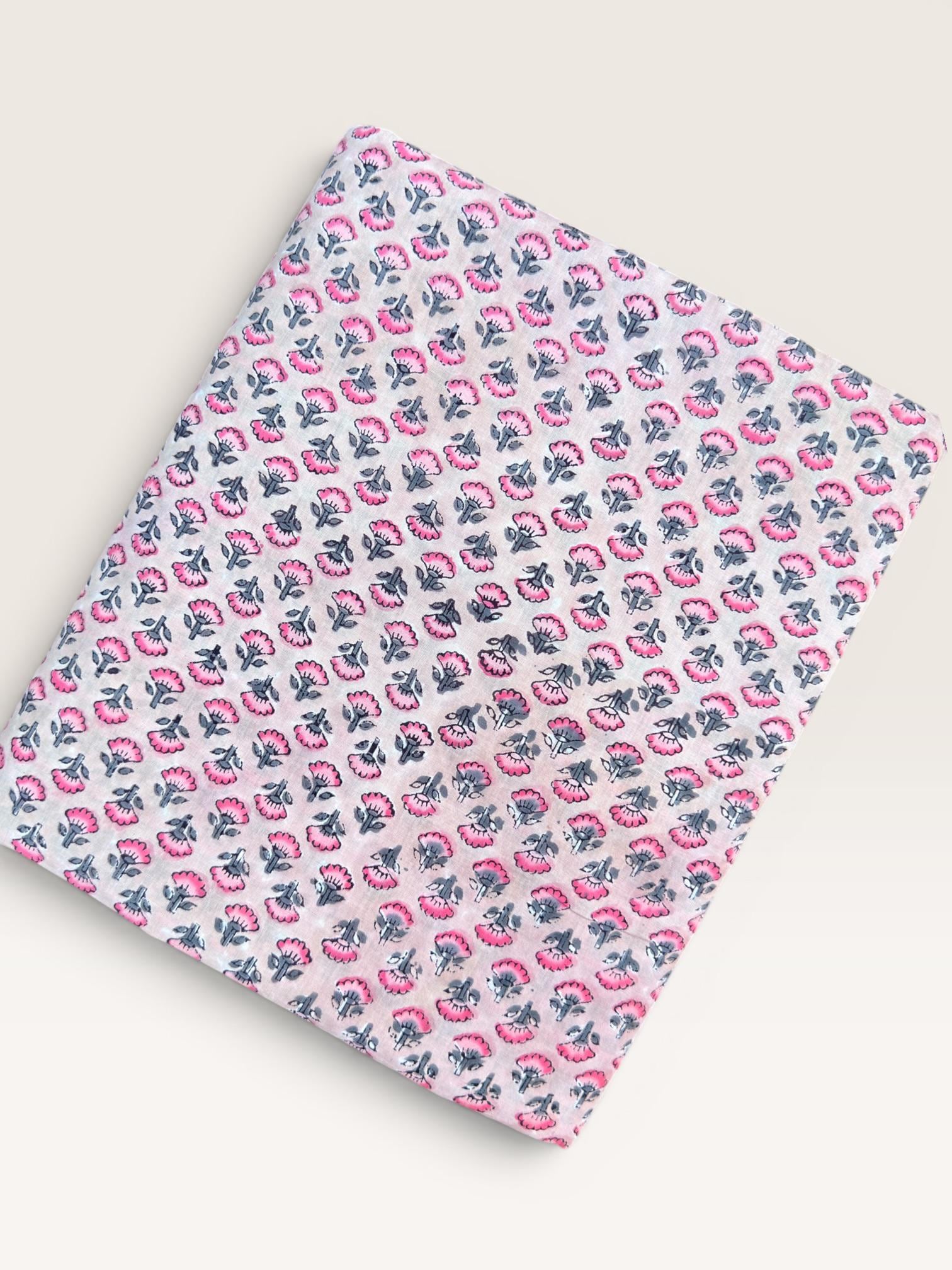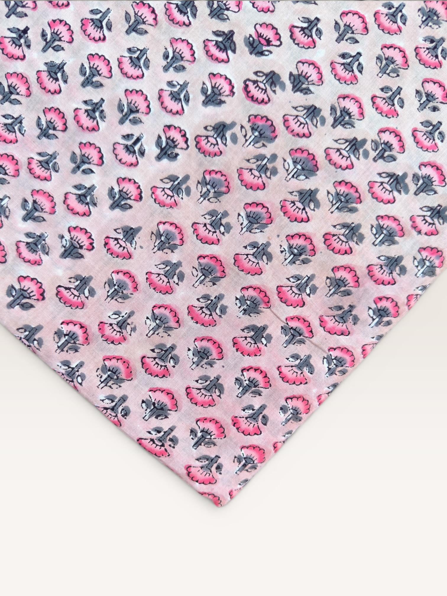 Each piece is carefully handcrafted using traditional block printing techniques, giving it a unique charm and artisanal touch. The delicate floral design paired with a detailed border adds sophistication and versatility to the fabric.